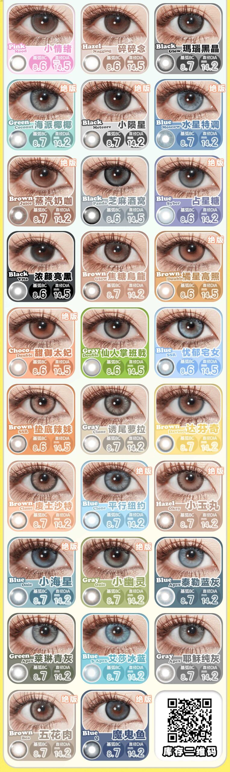 Please check stock availability before placing order, Pink Mood 小情绪, Hazel Nagging 碎碎念, Coconut Green 海派椰椰, Meteore Black 小陨星, Moscow 水星特调, Juice 蒸汽奶咖, Vita Black 浓颜亮黑, Vita Brown 淡颜浅棕, Cyber Blue 占星糖, Double Choco 甜御太妃, Double Gray 仙人掌班戟, Double Brown 橘星高照, SSR Brown 垫底辣妹, SSR Blue 忧郁宅女, Panda Black 芝麻酒窝, Crystal Moon 月光罐头, Clone Brown 废土沙特, Clone Blue 平行纽约, Clone Gray 诱尾萝拉, Clone Green 青涩威廉, Davinci 达芬奇, Onic Blue 小海星, Onic Gray 小幽灵, Bea Brown 五花肉, Okey Hazel 小玉丸, Q Blue 魔鬼鱼, Apex S-Blue 爱莎冰蓝, Apex Gray 耶稣纯灰, Apex Blue 泰勒蓝灰, Apex Green 莱琳青灰, Glow Black 玛瑙黑晶, Glow Violet 银河牛仔(0-1000), Cola Blue 琉璃水光(0-1000), Glow Brown 焦糖乌龙, Oasis Green 初恋青提(0-1000), Ordia Gray 雀石灰(0-1000)